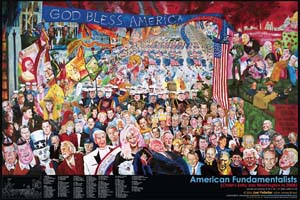 American Fundamentalists Project (2 March 2007) - This huge painting, completed in May 2004, continues to morph and evolve (take that, creationists!). After shipping and setting it up all over the US in 2004-6, including taking part in panels and public lectures, it is temporarily back in Southern California, but continues to attract interest and conversation. Aug 2006 events included an on-air discussion on Los Angeles' Air America affiliate KTLK 1150AM, plus a fundraiser display in Riverside for a Democratic congressional candidate (go to the American Fundamentalists website for details and regular updates). This painting has allowed the speaker/activist in me to develop; in 2007 it may resurface as a multi-media stage presentation (a la Laurie Anderson & Spaulding Grey). The issues are not going away any time soon, and niether am I. In the meantime I am available to display and speak about the work anywhere in North America and Europe, so send your invites!
