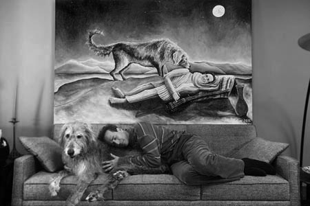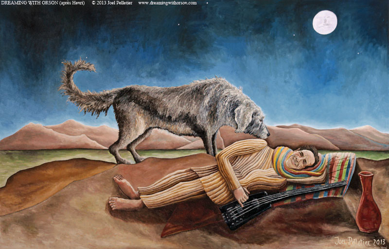 ![]() Dreaming With Orson (30 December 2013) - I've just completed a LONG planned painting, originally conceived after first seeing Henri Rousseau's original THE SLEEPING GYPSY at MOMA in NYC in 1985, hanging the poster in my apartment, then getting my first Irish Wolfhound in 1993. Although not as large as a real lion, these doggies are about as big as you can get, and I even dressed Scruffy up a lion a couple of times for Halloween costume contests (which he won). As a musician with a large animal, the fit seemed perfect to me, and Rousseau is one of my favorite painters, but over 20 years of planning (both as a painting and/or a staged photograph) only finally became reality when my current wolfhound (and Scruff's grand-nephew) Orson, now almost 11 years old, had what I believe was a small stroke and ended up in the hospital unable to walk (which, for a 130lb dog, is essentially a death sentence). I somehow managed to nurse him back to health, and was reminded about my version of Rousseau's painting having just revisited MOMA a month earlier. I love Orson so much, and we are very bonded, and it became very important that I complete this painting while he was still alive (and here it is, about a month later).