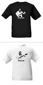 Updated WWJD T-Shirts (13 January 2011) - A play on the "What Would Jesus Do?" hats, t-shirts and accompanying lectures and disapprovals that inevitibly follow, I have recast it as "What Would John Do?", a common question in my mind as I learned the music, stage persona and life of THE WHO bassist John Entwistle while performing in a Who tribute band (which ended in 2010). John himself answered this question definitively by dying in a Las Vegas hotel room with a pair of strippers and (apparently) too much cocaine. I prefer to concentrate on his musical choices when asking this quesiton, but you can think what you want... I have had t-shirts professionally manufactured with this original art, and it already seems to be a hit with bassists and Entwistle fans worldwide. There are now BLACK SHIRTS and GREY SHIRTS, and I am catching up on filling orders starting in February 2011. Order yours today - $20 + $5 USA/Canada shipping, all others email first for rates. Available in men's Medium and Large Hanes tees, they fit a bit large, and don't seem to shrink much.