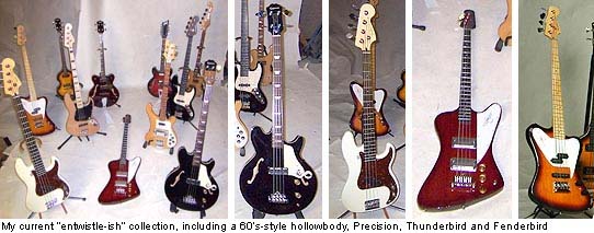 Basses moved me in a very different direction. For almost 20 years I have been a Steinberger bass player. In the 70's early 80's I built my own basses, a few inspired by John Entwistle's Thunderbird and Chris Squire's Rickenbackers. Then in 1983 I played my first Steinberger L2 (you remember, the HEADLESS polycarbonate ones), and realized I could never build one as perfectly balanced (physically and sonically), so I sold all my "pieces of wood" and never looked back (I have a passing relationship with Ned Steinberger to this day, and own a few Steinberger basses from their pre-Gibson days, as well as one of Ned's NS Design electric uprights). John Entwistle owned ONE Steinberger, but never played them live. In fact, he owned HUNDREDS of basses, and there is an incredible book of his bass collection (or part of it, anyway) published just before his death. At the 2003 auction of his estate, many of these basses sold for HUNDREDS OF THOUSANDS of dollars, and most of them sit entombed in glass casses throughout the world (including at many Hard Rock Cafes, and one wonderful 1960's Gibson Thunderbird in a plexi case at West LA music - NO, THEY WON'T LET ME PLAY IT!!!).