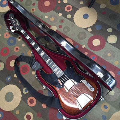 A Thunderbird bass (he bought the last 10 from Manny's Music in 1971 or so when he found out they stopped making them). Mine started as an Epiphone Thunderbird bass, but the only orignal part left is the body (which STILL needs to be refinished someday for the original brown instead of reddish color)