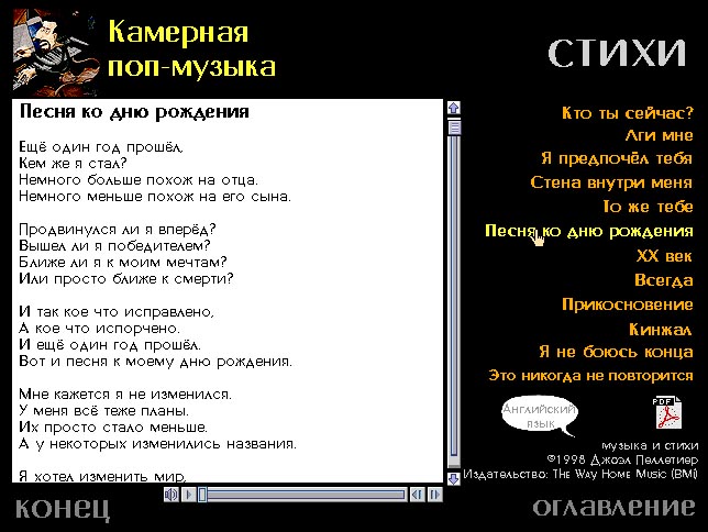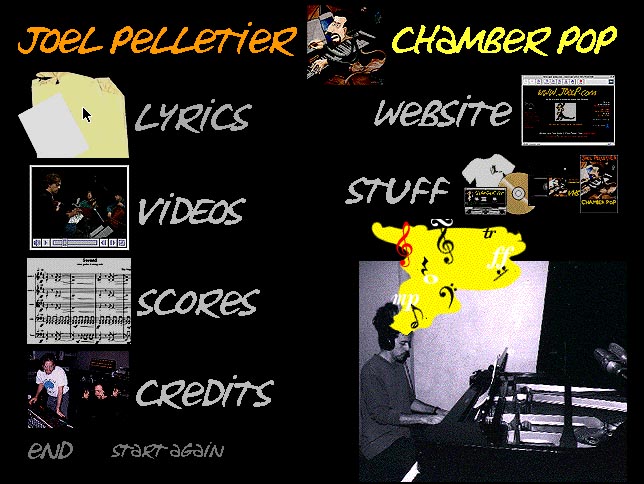 Chamber Pop (1999) is my 12-song audio CD and ten-language CD-ROM, known as an Enhanced CD. The term "chamber pop" is a desciption of my musical style, a hybrid of pop songs and modern classical-style chamber music (think of George Martin's classical collaborations with the Beatles). Drawing on my classical training and my years as a pro rock/pop musician, it combines to create a unique but natural acoustic sound and style for the end of the 20th century.