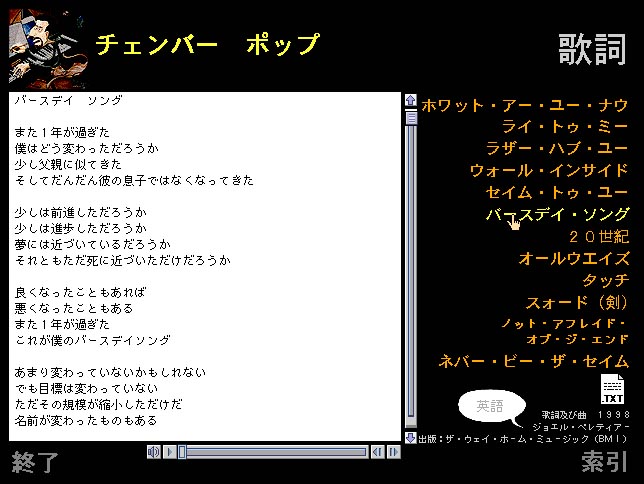 All of the lyrics from "Chamber Pop" are viewable and printable as Adobe PDF files or text files in all 10 languages (as included on the CD). You can download them by clicking on the proper language (below). Version 3.0 or later of the Adobe Acrobat Reader must be used to read the files (free from www.adobe.com). The Japanese and Chinese lyrics are text files, and Japanese/Kanji or Traditional Chinese fonts/operating systems are required.