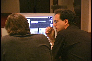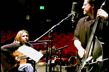 A demo recording session for my next pop album/project/CD/DVD/whatever, tentatively entitled "Chamber Pop: (Real) Time," was done in 2002. My band (Brian Patridge and Kate Lewis), engineer Brian Soucy, and 11 local pro string players donated an afternoon to help test the 5.1 recording gear I have been accumulating over the last two years. Above are stereo MP3 versions of the 4 songs - below is a video of the shortest of the 4, Minute Song, from footage shot by Jeff Daly (thanks VERY much, Jeff). I am working on DVD authoring to produce a DVD demo with all 4 live takes, including 5.1 AND stereo 24/48 audio tracks (switchable with the DVD remote).